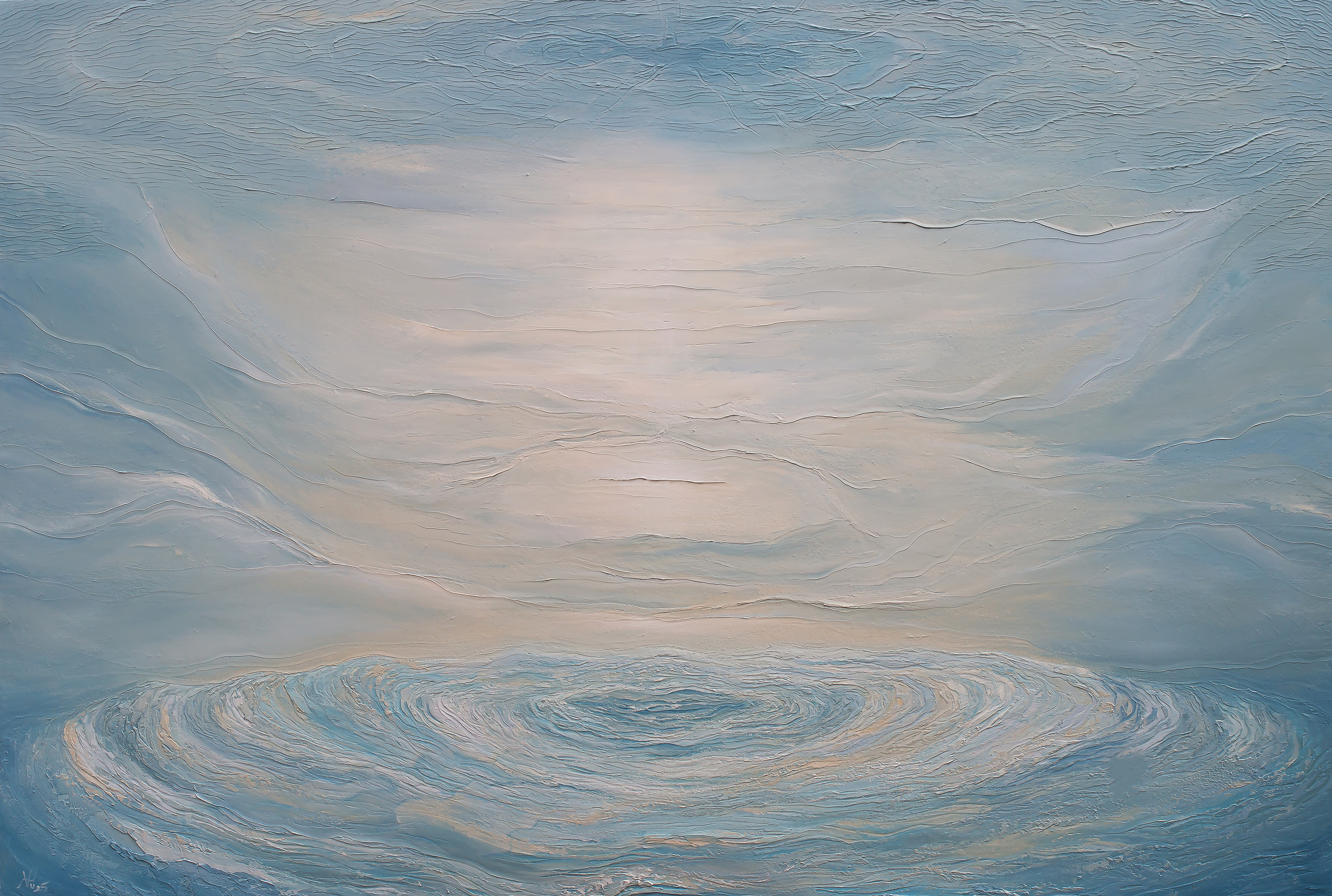Bức tranh vẽ hình ảnh Thiền thủ ấn ẩn hiện trong thinh không cùng sóng nước đang chuyển động đồng tâm thể hiện cho tính “ định” của cái tâm, cùng an trú, cùng tĩnh lặng, từ đó ánh sáng mới xuất hiện, chỉ đường dẫn lối trước những giông tố của cuộc đời.