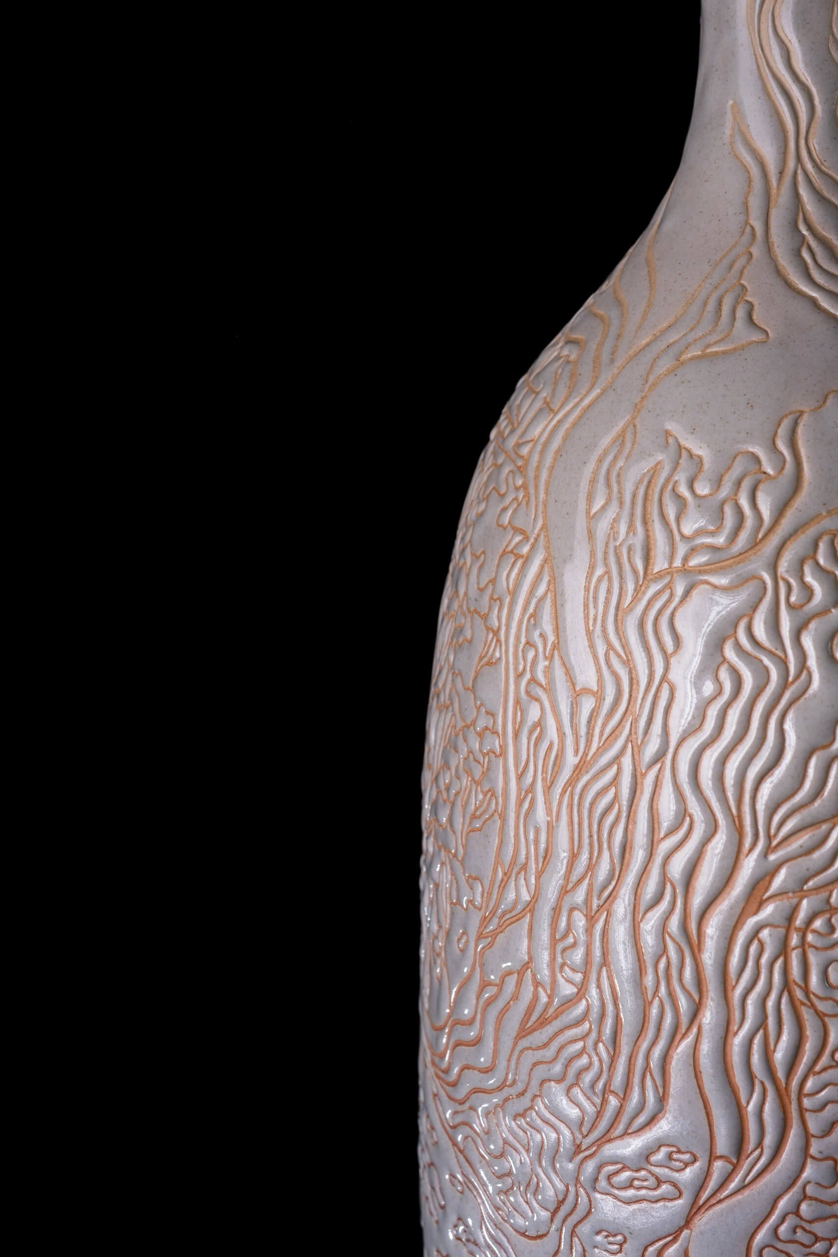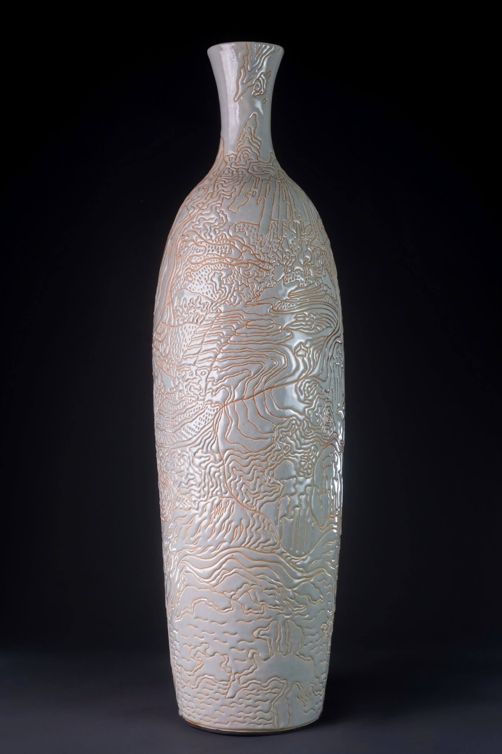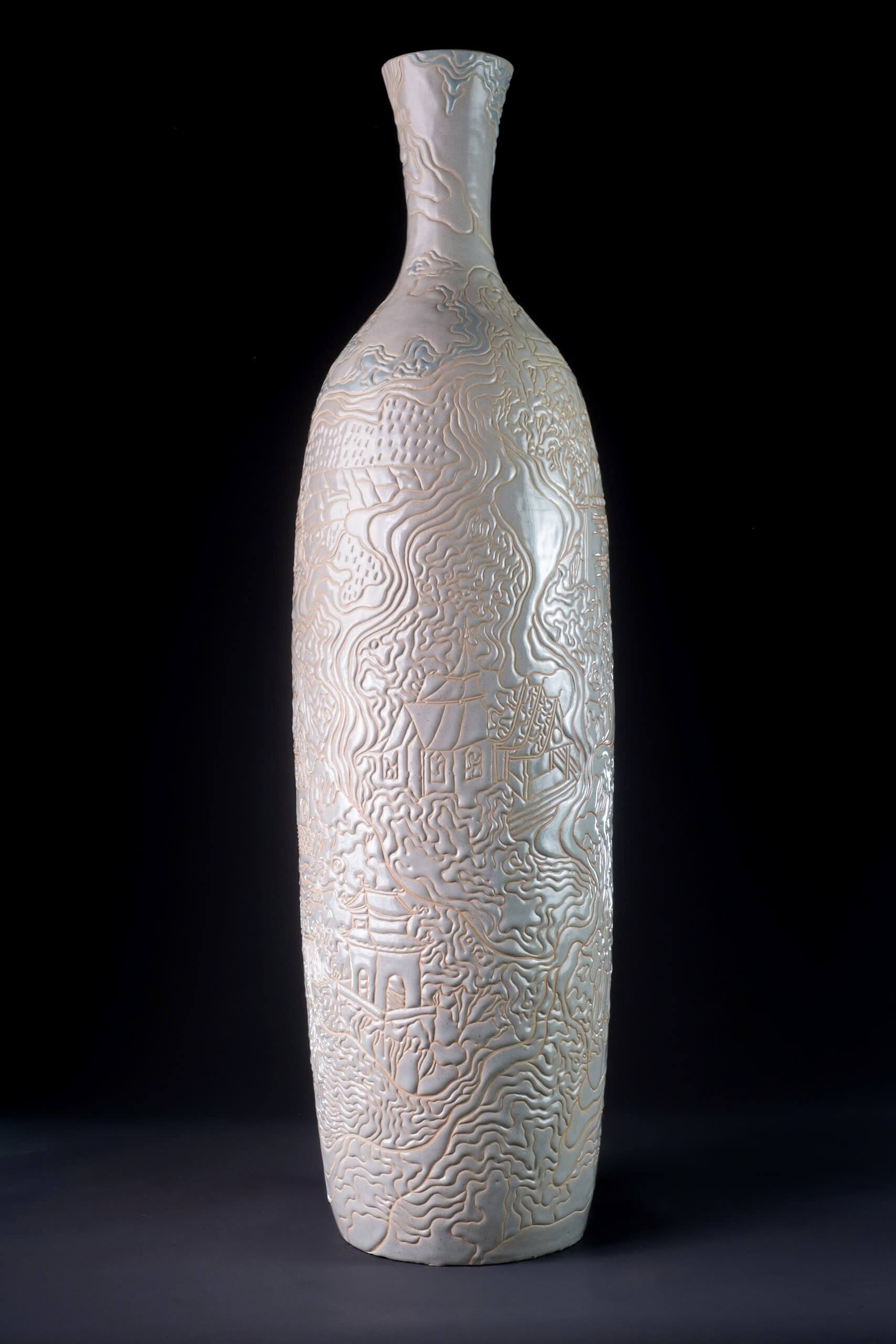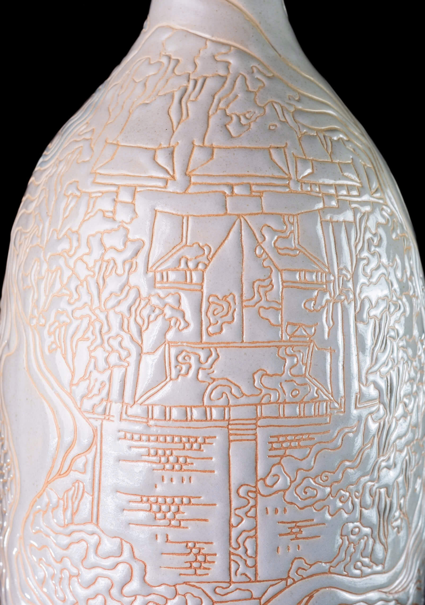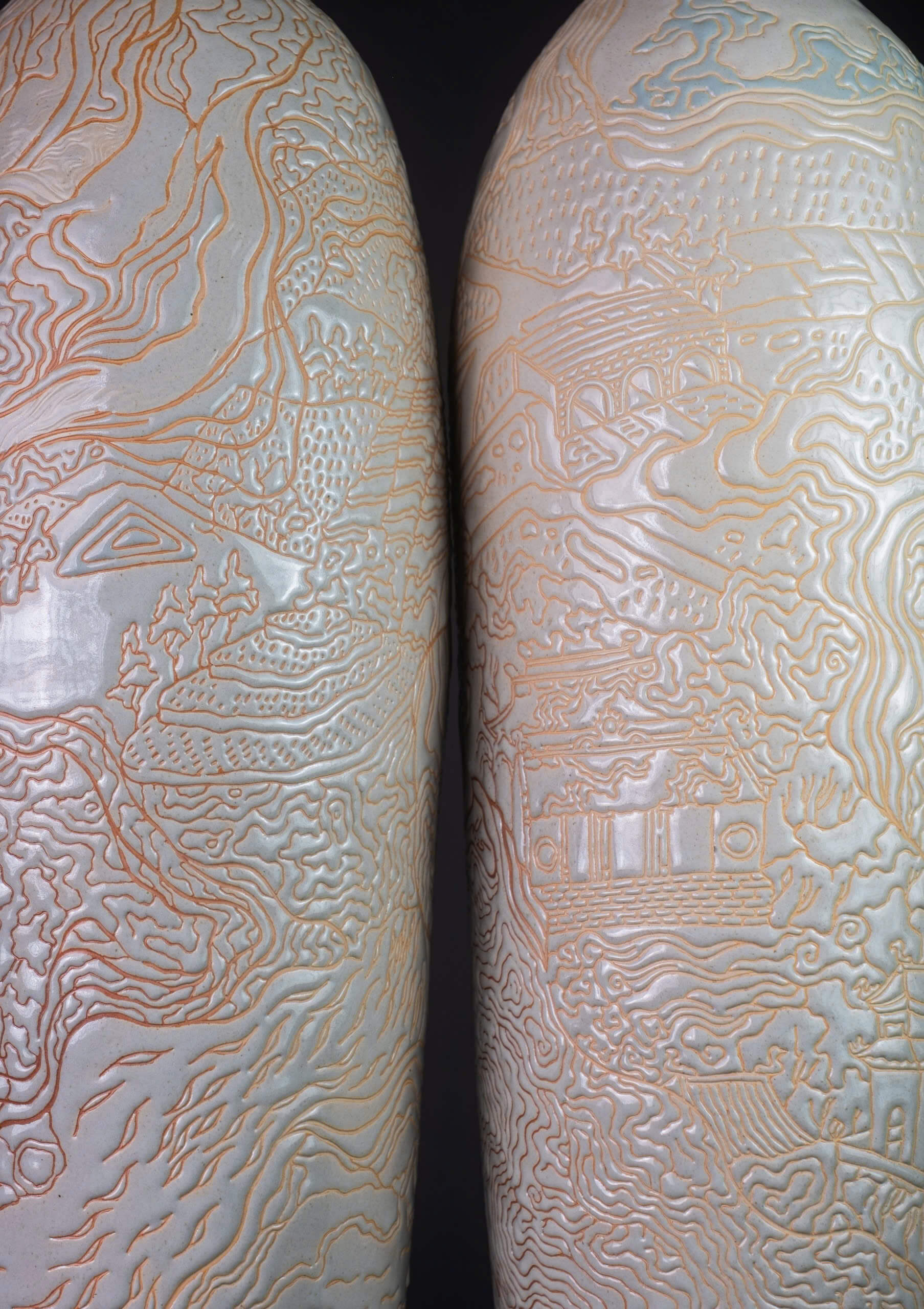 • Dệt quê hương là bộ đôi bình gốm vẽ lại kí ức ở vùng quê Hậu Lộc, Thanh Hóa. Tác phẩm sử dụng kĩ thuật của dòng gốm Biên Hòa được chế tác hoàn toàn bằng phương pháp thủ công truyền thống, trải qua quá trình nung củi khắt khe và phủ men đá cổ điển, tạo ra sự biến thiên về màu nhờ hỏa biến.Mỗi tác phẩm đều khắc họa lại các địa danh văn hóa – lịch sử, kiến trúc của Thanh Hóa nói chung và vùng Hậu Lộc nói riêng. Tất cả được bao bọc bởi họa tiết lớp lang đặc trưng của Nguyễn Thanh Vũ như từng vùng kí ức ẩn hiện trong mây khói.